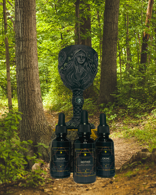 These early formulary traditions laid the foundation for holistic beauty rituals—an approach we carry forward in our formulations today. Powered by metaphysics, The Black Raven Metaphysical Apothecary honours ancient beauty wisdom and ritual, while embracing modern science to craft alchemical, potent elixirs with ultra nourishing, lipid-rich botanicals to enhance hydration and maintain the skin barrier. Inspired by the timeless archetypes of Maiden, Mother, and Crone, our Triple Goddess Beautifying Oils support a different stage of inner and outer transformation while aligning you with your natural rhythms. Each application follows the lineage of those Wise Women, to echo what once was – a moment of connection, a return to self, and a sealing of intention — beauty as nourishment, ritual, and quiet power.